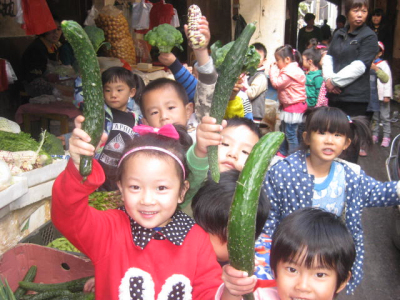 11月2日上午,我园中班的小朋友在老师的带领下,兴致盎然地来到菜市场。来来往往的人群、此起彼伏的叫卖声、玲琅满目的各类蔬菜和水产品让孩子们目不暇接,惊奇不已,惊喜不断。他们仔细地观察着各种蔬菜:浑身长满小刺的黄瓜;不同形状、颜色的辣椒们;绿长发的白萝卜;宝塔般的小竹笋……有的甚至忍不住用小手去摸摸这儿摸摸那儿。当发现自己没见过的蔬菜时,孩子们会有礼貌地轻声向摊主询问,每多一项见识时,那份喜悦便溢于言表,他们开心地和同伴分享着自己的收获和快乐。