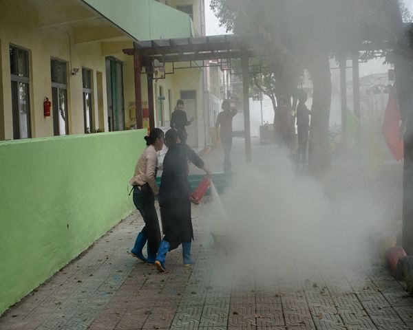 下午3:00,随着火警警报信号的响起,各班教师、保育员迅速按紧急预案的疏散线路带领幼儿拿起湿毛巾,捂住口鼻,猫着身子,分两道楼梯迅速且有序下楼。很快孩子们集中到操场安全地带,教师迅速地清点人数,并向总指挥报告。整个疏散活动只用了2分多钟。演习结束后,我们请保安冯师傅进行灭火示范,让老师、保育员进行学习,通过现场的操作,大家进一步了解了灭火器的使用方法。