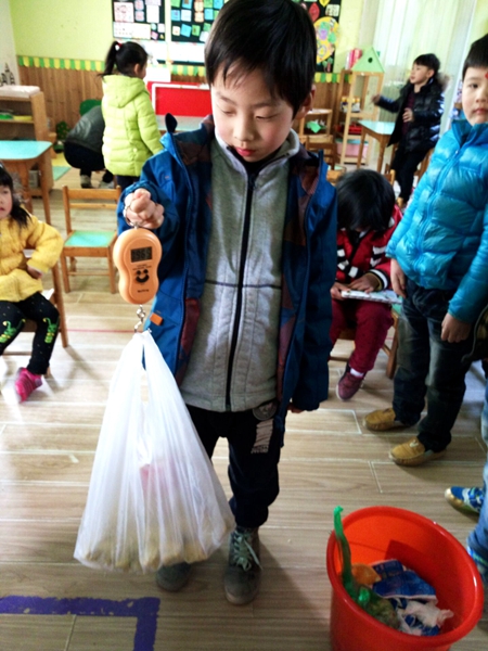 在充分的宣传后,幼儿园各班开展起“果皮大收集”的活动。每天,孩子们在吃好水果后,都会自觉地把剩余的果皮放到专用的收集袋中,由值日生称一称,用自己的方式记录下果皮的种类和数量,再请保育员送到专用的冷藏柜存放起来。