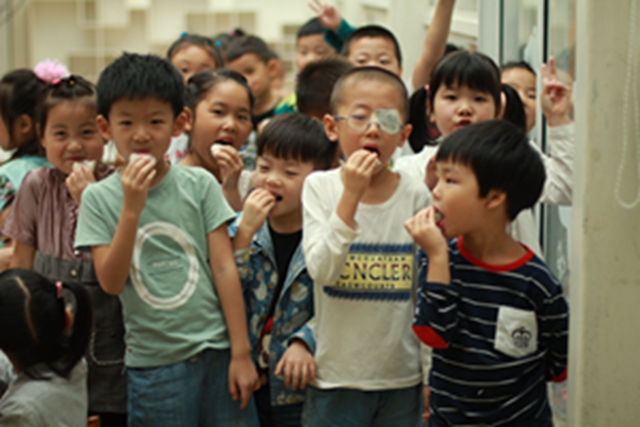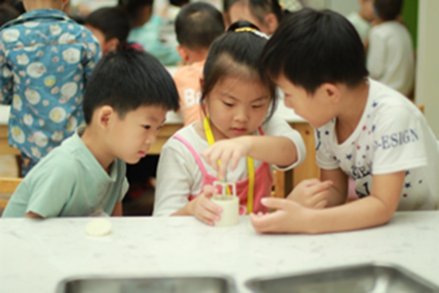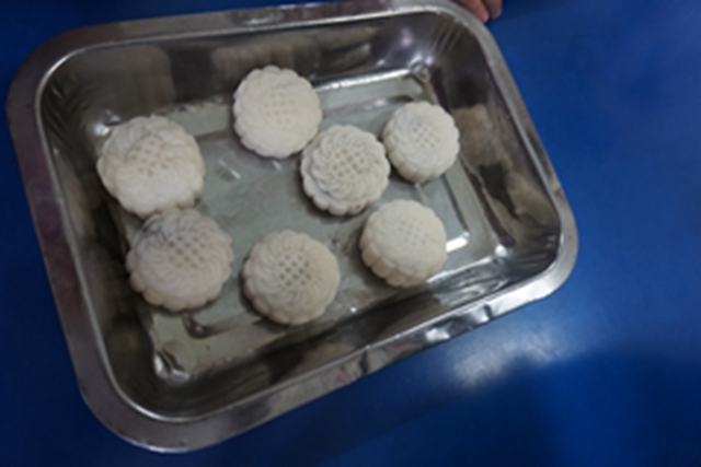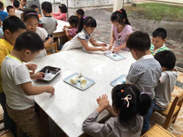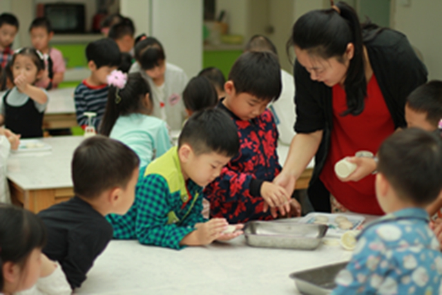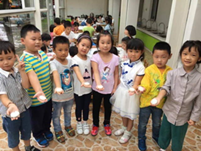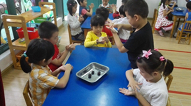 “吃月饼”是孩子们对于中秋节最熟悉的庆祝方式,而“做月饼”却是孩子们从未体验过的。孩子们认真遵守七步洗手法将小手清洗干净,仔细倾听制作方法,耐心细致地制作冰皮月饼。短短的时间里,孩子们搓皮、包馅、塑形、脱膜,环环紧扣,一气呵成。看着手中剔透可爱的小月饼,孩子们忍不住咬下一口。“好好吃啊!”孩子们惊叫着庆贺,也将我们的庆祝活动推向了高潮。